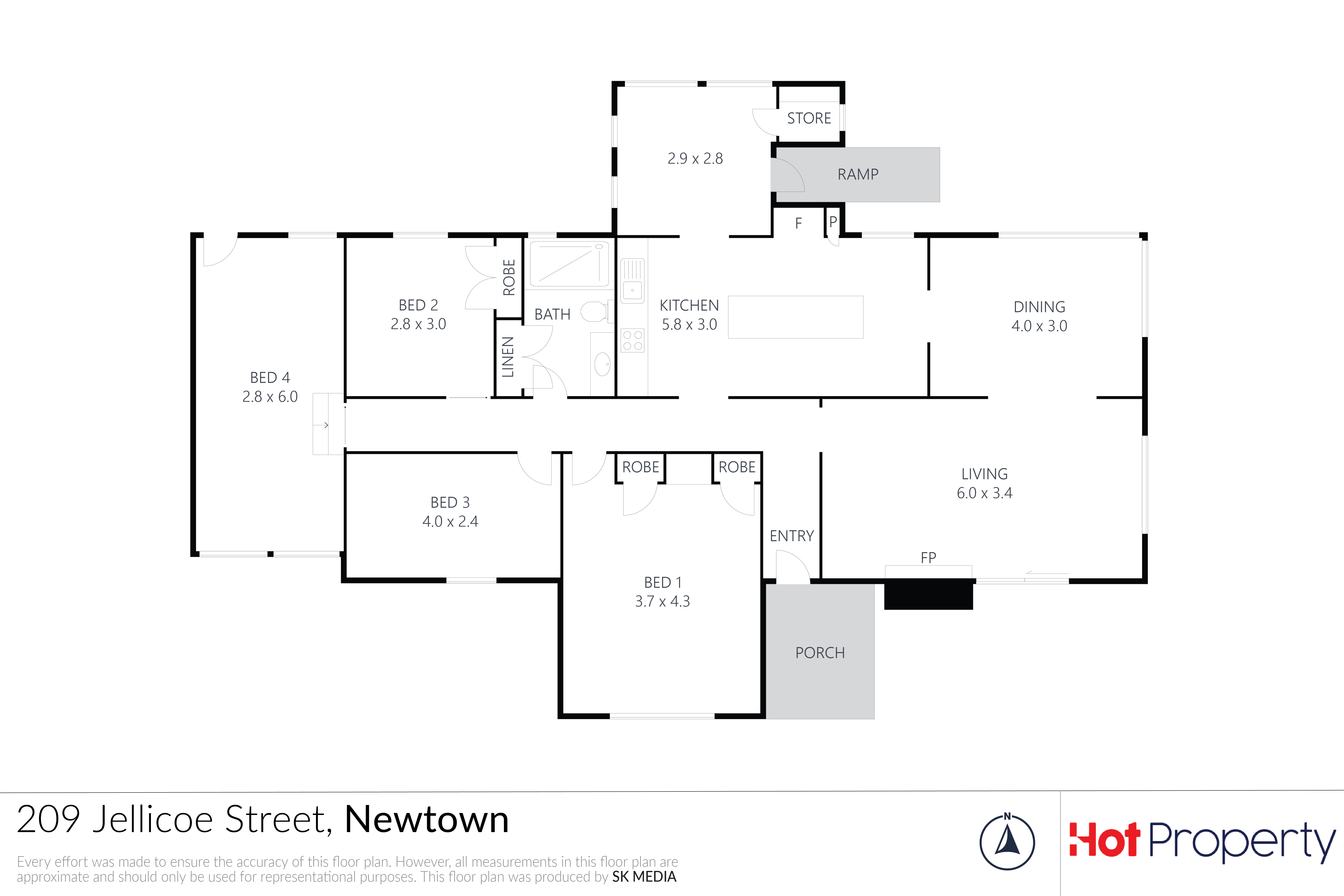 Just next door, 209 Jellicoe Street offers 4 bedrooms, 1 bathroom, and 2 car spaces, with a single-level, low-maintenance layout. The home features a welcoming entry, a spacious living room with a fireplace, ceiling fans, air conditioning, and a large picture window filling the space with natural light. The updated kitchen is a showpiece, complete with white cabinetry, timber-look benchtop, marble-patterned splashback, walk-in pantry, built-in oven and stovetop, and a central island for extra workspace and casual seating. Dining flows effortlessly from the kitchen, leading to a paved entertaining area and private backyard. All four bedrooms are generously sized, with two featuring built-in robes and the fourth offering direct access to the backyard, ideal for a private retreat or guest accommodation. The renovated bathroom combines style and function, with a sleek light wood vanity, large mirrored cabinet, decorative navy tile accent, walk-in shower, and dark grey flooring. Additional features include a separate laundry, storage room, fully fenced yard, ceiling fans, and a ramp for easy access.